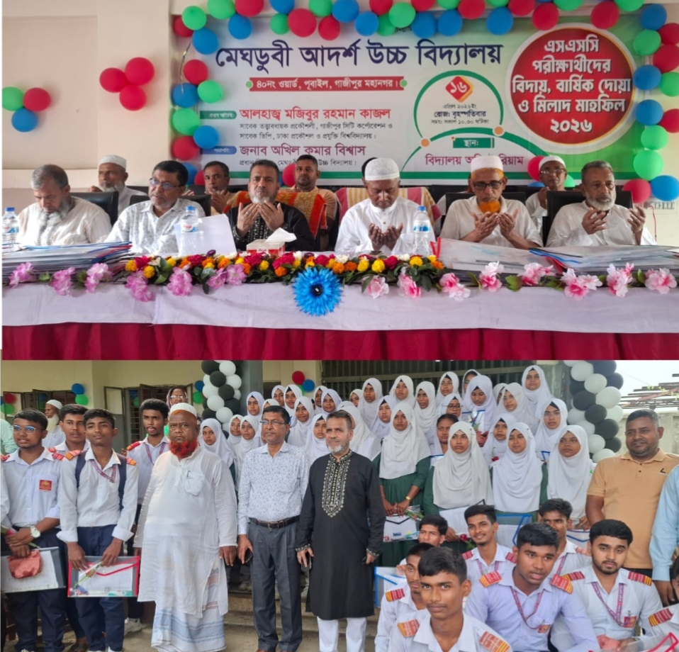 মোঃ আল-আমিন সরকার পূবাইল (গাজীপুর) প্রতিনিধি: গাজীপুর মহানগরের পূবাইল থানাধীন ৪০ নং ওয়ার্ডের মেঘডুবী আদর্শ উচ্চ বিদ্যালয়ের আয়োজনে বৃহস্পতিবার (১৬ এপ্রিল ) বিদ্যালয় প্রাঙ্গনে আনুষ্ঠানিকভাবে ২০২৬ সালের এসএসসি পরীক্ষার্থীদের বিদায়ী সংবর্ধনা ও দোয়া অনুষ্ঠিত হয়েছে।ছাত্র-ছাত্রীদের বিদায়ী সংবর্ধনা অনুষ্ঠানে সভাপতিত্ব করেন মেঘডুবি আদর্শ উচ্চ বিদ্যালয়ের প্রধান শিক্ষক বাবু অখিল কুমার বিশ্বাস, প্রধান অতিথি হিসেবে উপস্থিত ছিলেন,গাজীপুর সিটি কর্পোরেশন এর সাবেক তত্ত্বাবধায়ক প্রকৌশলী,ঢাকা প্রকৌশল ও প্রযুক্তি বিশ্ববিদ্যালয়ের সাবেক ভিপি, মজিবুর রহমান কাজল, বিশেষ অতিথি হিসেবে উপস্থিত ছিলেন,পূবাইল আদর্শ বিশ্ববিদ্যালয় ডিগ্রী কলেজের ভারপ্রাপ্ত অধ্যক্ষ আব্দুর রশিদ, পূবাইল ইউনিয়ন বিএনপির সাবেক সাধারণ সম্পাদক, আব্দুল আলীম,পূবাইল থানা বিএনপির সহ-সভাপতি নূর মোহাম্মদ নূরালি ,বীর মুক্তিযোদ্ধা আফজালুর রহমান, পূবাইল থানা বিএনপির সাংগঠনিক সম্পাদক এম নজরুল ইসলাম।এসময় বিদ্যালয়ের সকল শিক্ষক-শিক্ষিকা বৃন্দ ও অভিভাবক বৃন্দাগণ উপস্থিত ছিলেন।